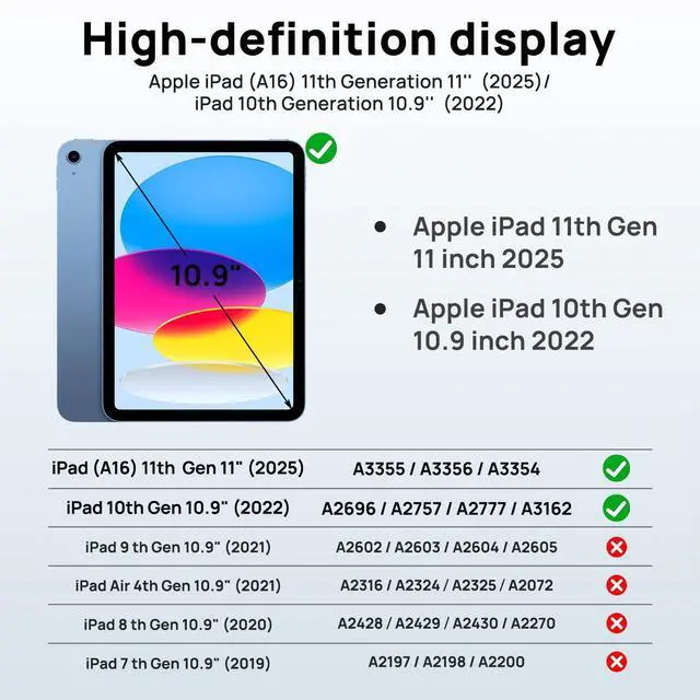 [Model Compatibility]: Compatible with iPad (A16) 11th Generation 11 inch, Model: A3354/A3355/A3356; iPad 10th Generation 10.9-inch 2022, Model: A2696/A2757/A2777. NOT compatible with other models, Please check your model number before purchasing