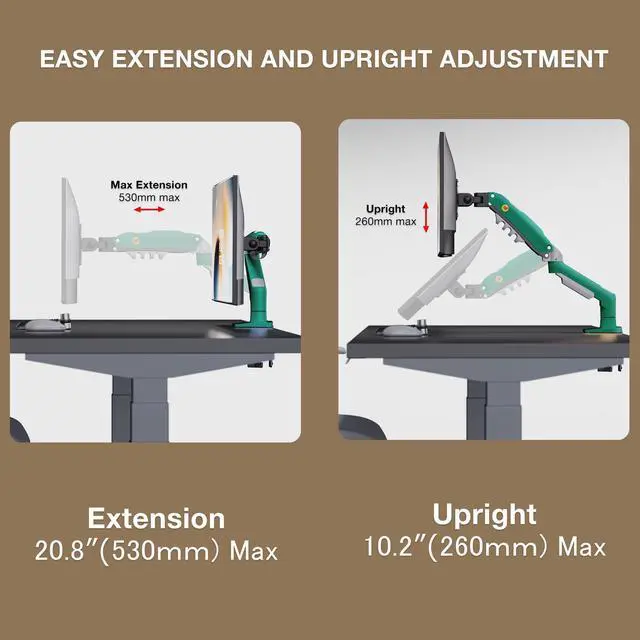 Full motion and more Adjustable: The monitor can be rotated and tilted effortlessly in any direction, Tilt Angel from -30 degrees to +85 degrees with a combined 360 degree VESA Part Rotations, Upright range is 10''(260 mm) with swivel angel ±90 degrees ,Easy positioning of your monitor in any desirable position; Personalize your workstation any way you want