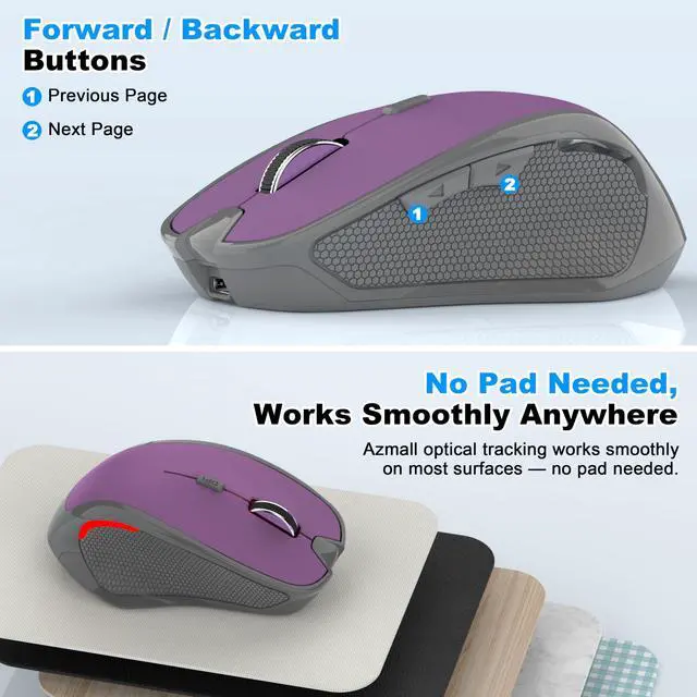 Bluetooth Wireless Computer Mouse, 2.4G Rechargeable Small Ergonomic Optical Mouse Jiggler for Office/Home with Forward/Back Buttons & USB-C/USB-A for Laptop, Desktop, PC, Mac, MacBook - Purple