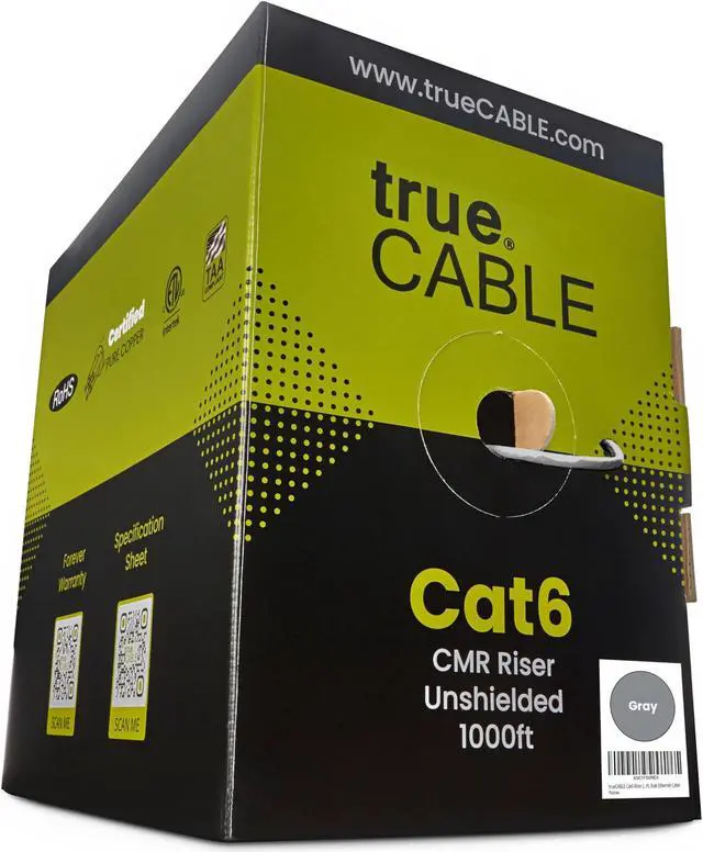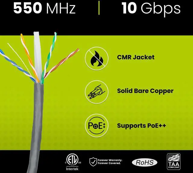 [High Performance Network Cable] This riser rated cat 6 lan cable is 23 AWG with 4 pairs (8 conductors). Suitable for 1 and 5 Gigabit speed up to 328 feet and 10 Gigabit speed up to 165ft depending on the installation environment. Bandwidth tested up to 550 MHz. Supports Power over Ethernet: PoE/PoE+/PoE++ (IEEE 802.3af/at/bt) 4PPoE up to 100W.