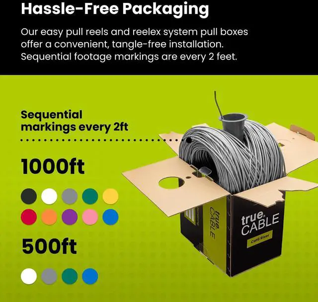 [Hassle Free Packaging] 1000 feet (305 meters) comes conveniently pre-spooled in a tangle free, easy pull box so you dont have to worry about getting behind on your next job.