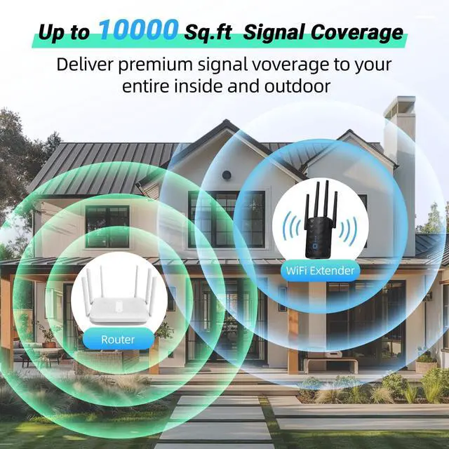COVERAGE: The WiFi Extender Signal Booster is equipped with four high-performance antennas that boost Internet Wi-Fi coverage to 10,000 sq. ft, eliminate dead zones, buffering, and dropped video calls, ensuring you always have a stable and reliable internet connection.