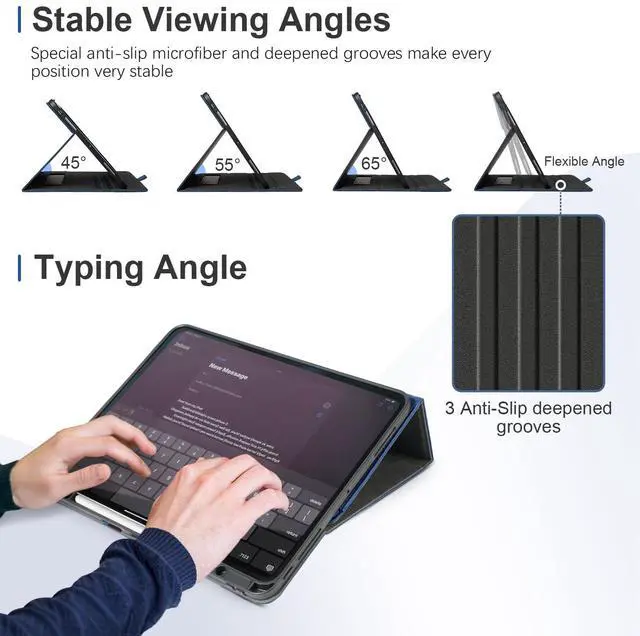 Stable 4 Standing Angles: The case provides 3 viewing angles and 1 typing angle,the ease of adjusting the stand to various angles has significantly improved viewing/typing/drawing experience and comfort. Special anti-slip microfiber and deepened grooves make every position very stable
