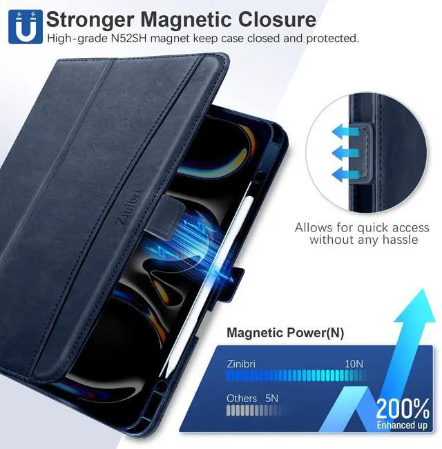 Zinibri Handcrafted Case for iPad Pro 11 Inch M5 2025/M4 2024 with Pencil Holder & Hand Strap & Pocket,Auto Sleep/Wake,Magnetic Closure,Multi Angles Stand Cover,Protective Folio PU Leather,Dark Blue