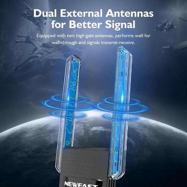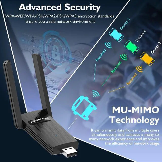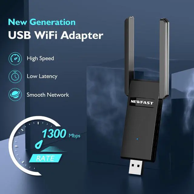 High-speed Dual Band WiFi - Newfast AC1300 Adapter Designed for high-speed streaming, seamless data transfer, and low-latency gaming. Dual-band technology delivers blazing-fast speeds up to 867Mbps on 5GHz and 300Mbps on 2.4GHz for lag-free WiFi.