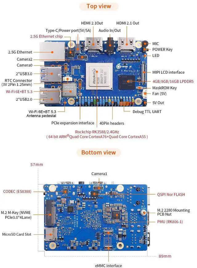 High Performance RK3588 - Orange Pi 5 Max uses Rockchip RK3588 8-core 64-bit processor with 4 Cortex-A76 (2.4GHz), 4 Cortex-A55 (1.8GHz) and independent NEON coprocessor. Adopting 8nm process design, the main frequency is up to 2.4GHz, integrated ARM Mali-G610, built-in 3D GPU, compatible with OpenGL ES1.1/2.0/3.2, OpenCL 2.2, and Vulkan 1.2