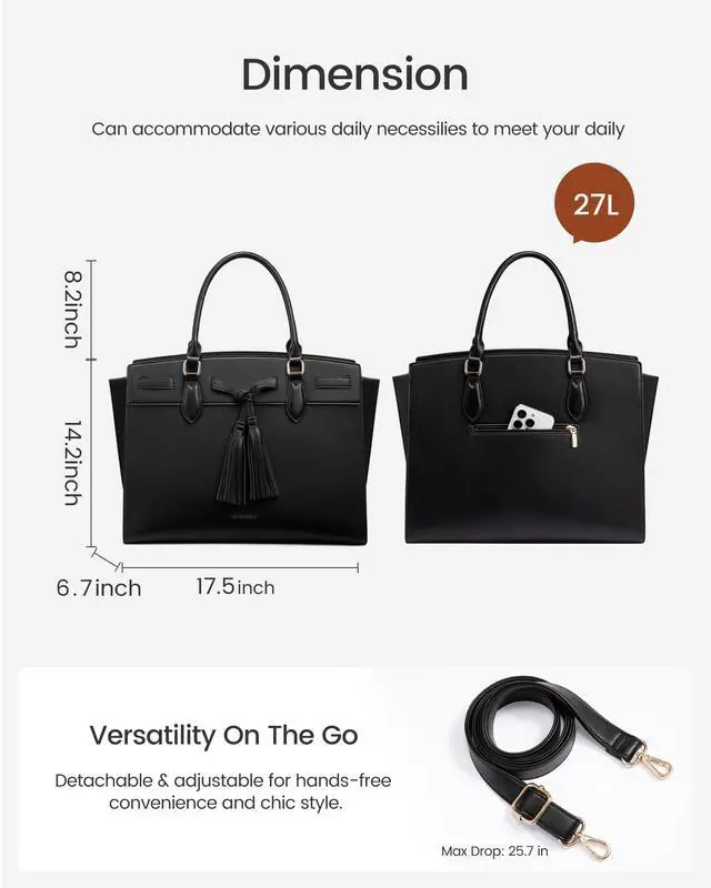 Stylish and Elegant Work BagThe LOVEVOOK work bags for women, with its chic tassels and luxurious look, adds confidence and charm at work or on business trips. It transitions effortlessly between a handbag, shoulder bag, and crossbody bag.(including an adjustable shoulder strap)