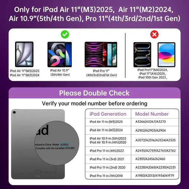 Compatibility: Perfectly designed for the 2024 iPad Air M2 (11 inch), 2025 iPad Air M3 (11 inch) and also compatible with the following models:2022 iPad Air 10.9-inch (5th Gen);2020 iPad Air 10.9-inch (4th Gen);2022 iPad Pro 11-inch (4th Gen);2021 iPad Pro 11-inch (3rd Gen);2020 iPad Pro 11-inch (2nd Gen);2018 iPad Pro 11-inch (1st Gen).