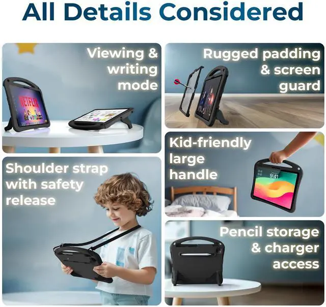 All Details Considered: iPad Air 13 case kids with extra stable dual-angle stand for kids to read, study, watch videos, play games, draw, paint; child-friendly oversized handle; pencil storage; charger access