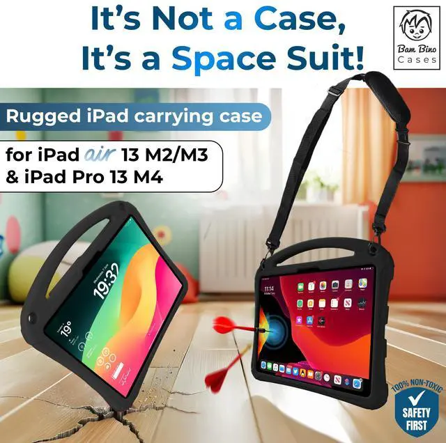 Bam Bino Space Suit Rugged Kids Case for Apple iPad Pro 13 M4, iPad Air 13 M2/M3 (2024/2025) Case for Kids with Built-in Screen Protector, Handle, Stand, Pencil Holder, Shoulder Strap (Cosmic Black)