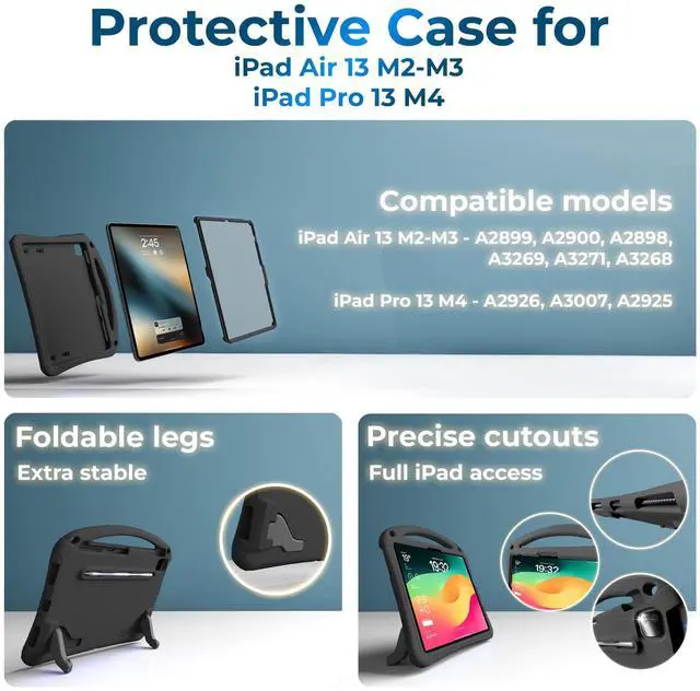 Original Case Design: crafted for iPad Air 13 inch/iPad Pro 13 inch 2024/2025; case for kids with shock-absorbing foam, built-in screen protector against drops, screen damage; practical adjustable shoulder strap with safety release