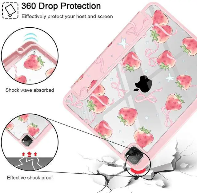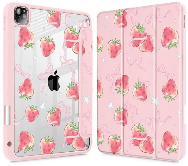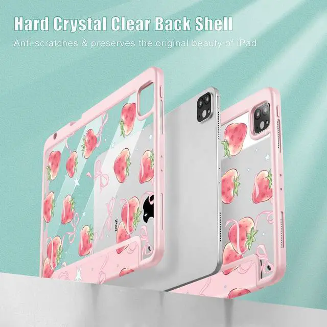 May Chen for iPad Pro 11 inch M2 4th Generation 2022, iPad Pro 11 3rd/2nd/1st Gen, Case with Transparent Shockproof Back Cover [Built-in Pencil Holder, Auto Sleep/Wake, Bow Strawberry