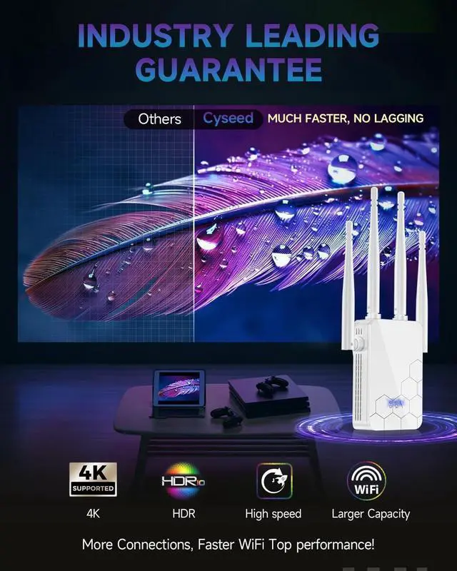 WE'VE GOT YOU 360°FULL SIGNAL COVERAGE: This internet boosters equipped with 4 cutting-edge external antennas achieve the stronger, higher penetration, extend your wireless internet network coverage up to 10000 sq.f, Eliminates WiFi dead zones to provide you consistent and stable WiFi throughout your home