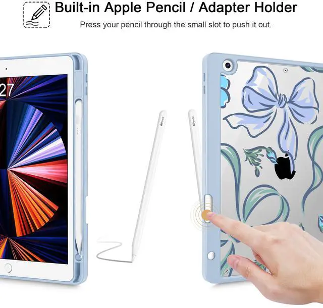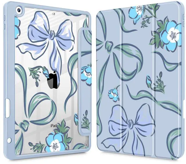 Mektron Printed Case for iPad 10.2 Inch 2021/2020/2019, for iPad 9th/8th/7th Gen Case, Buit in Pencil Holder with Shockproof Cover Clear Shell + Trifold Stand + Auto Wake/Sleep, Flowers-Bows-Blue
