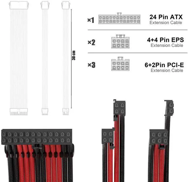 ABNO1 PSU Cable Extension Kit - 30CM Length, Sleeved Cable, 1x24Pin/2x8Pin/3x8Pin for ATX Power Supply (Black/Red)