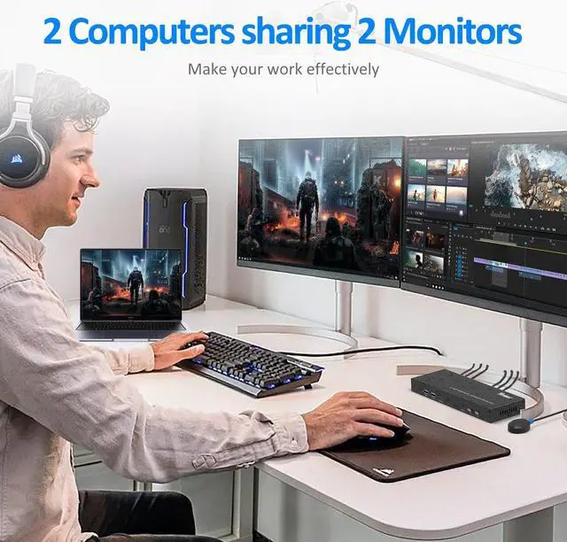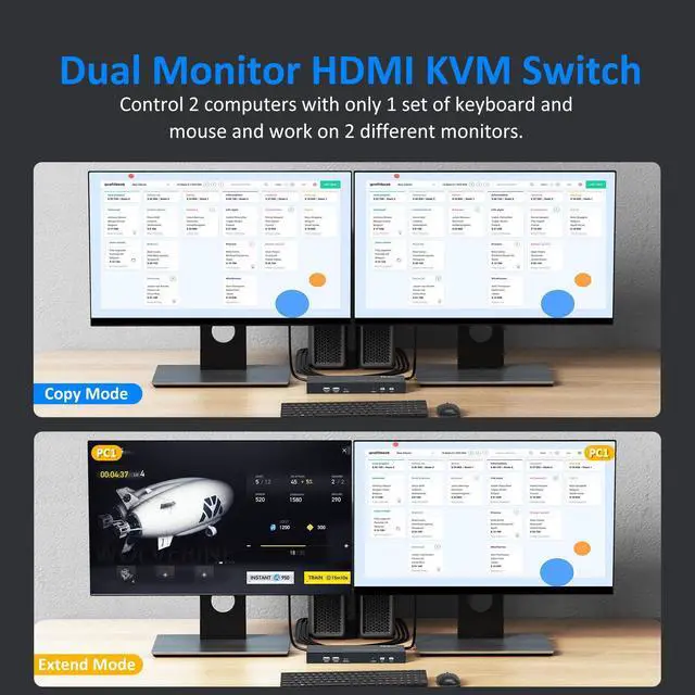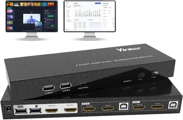 Yinker HDMI KVM Switch 2 Monitors 2 Computers, can allow you to control 2 PCs by one set of keyboard and mouse, share 2 HD monitors and 4 USB devices. Which are perfect work solutions for offices and home studios. (Please make sure your computer/laptop supports dual display)