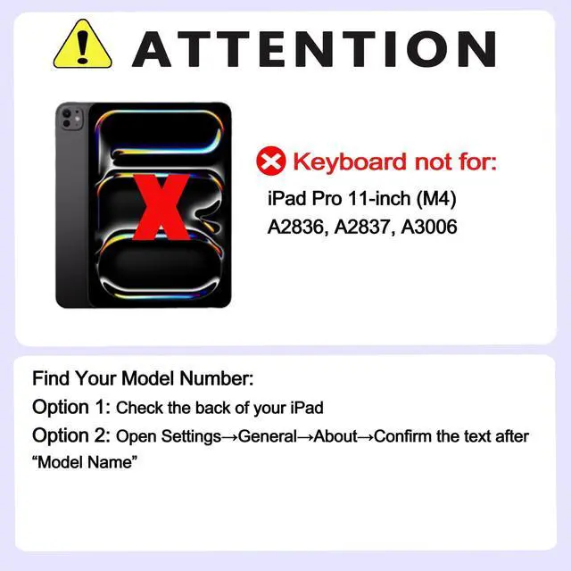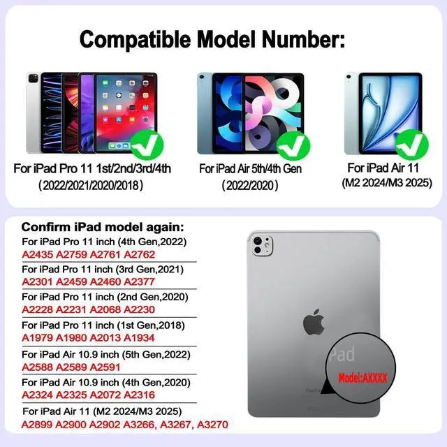 Compatible DevicesThis keyboard case is only compatible with iPad Air 11 inch M3 M2 (A3267,A3270,A2899,A2900,A2902).iPad Air 4th 5th Gen(A2588,A2589,A2591,A2324,A2325,A2072,A2316).iPad Pro 11 1st 2nd 3rd 4th (A2435,A2759,A2761,A2762,A2301,A2459,A246,A2377,A2228,A2231,A2068,A2230,A1979,A1980,A2013,A1934).Not suitable for other iPad devices.Please check the model number starting with ""AXXXX"" on the back of your iPad before purchasing(Note: Pencil and iPad are not included in this Product)
