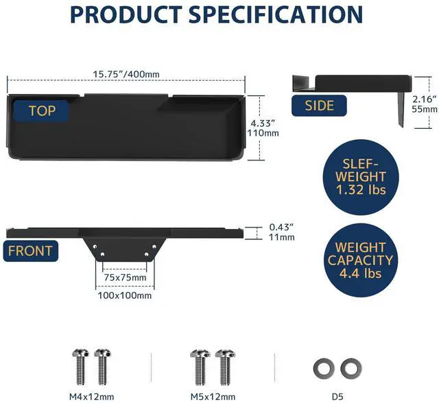 Product Specifications: Measures 15.7" x 4.3" x 0.43" and supports up to approximately 4.4 lbs. Compatible with VESA standards 75x75mm or 100x100mm, fitting a wide range of monitors