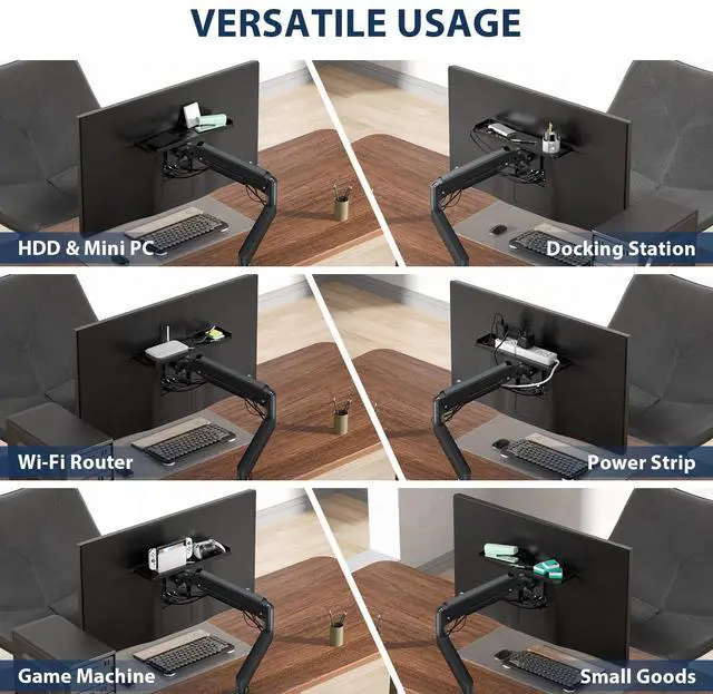VESA Mount Storage Rack: Keep your workspace clean and organized by storing various devices like external hard drives, game consoles, routers, power strips, and docking stations conveniently behind your monitor