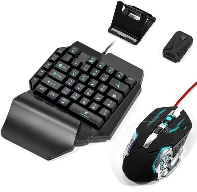 Combo Kit: 4-in-1 Mobile Gaming Combo Pack includes a one-handed gaming keyboard, a gaming mouse, a converter, and an adjustable phone stand, all specifically designed for Android systems