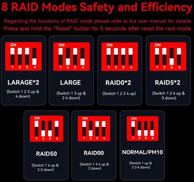 !!!NOTE:When the 10-bay enclosure being used, there is at least one hard drive must be inserted into HDD1-HDD5, same goes for HDD6-HDD10, 2 HDDs is a minimun quantity to be inserted.Please read the instructions carefully before trying!!!Be sure to save a good backup of your data before setting up RAID, which will format your hard drive after setting up RAID!!!!!!
