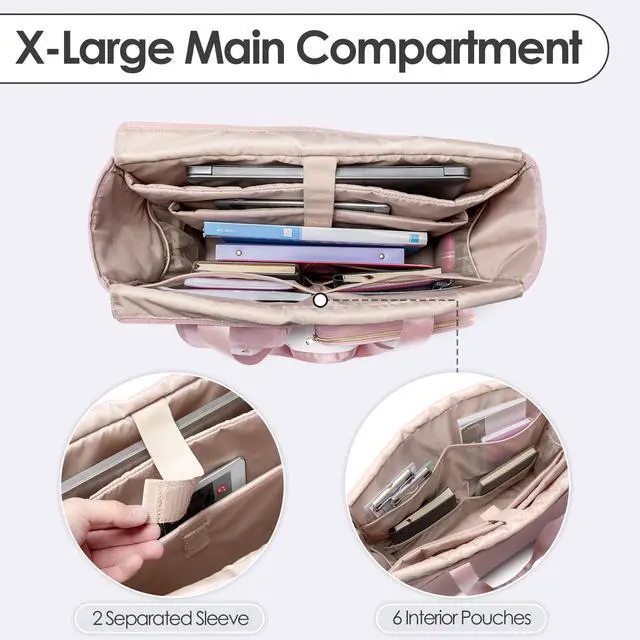 QUALITY MATERIAL: Made of heavy duty nylon fabric and sturdy zipper for added durability and long-term use. Well padded lining of this teacher tote helps protect your laptop from scratches and bumps. Attached with a hanging ring at front for keys or decoration.