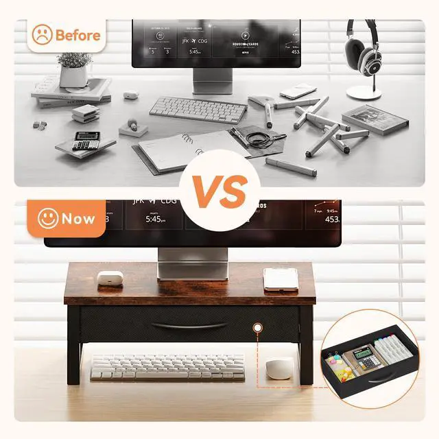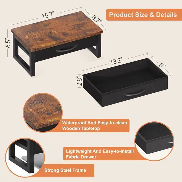 Keep Your Desk Tidy (with Cloth Drawer): This computer monitor stand provides a large storage space; Desktop, drawer, bottom, all can be used to store items; Placing small items in drawer will make the entire desktop look more tidy
