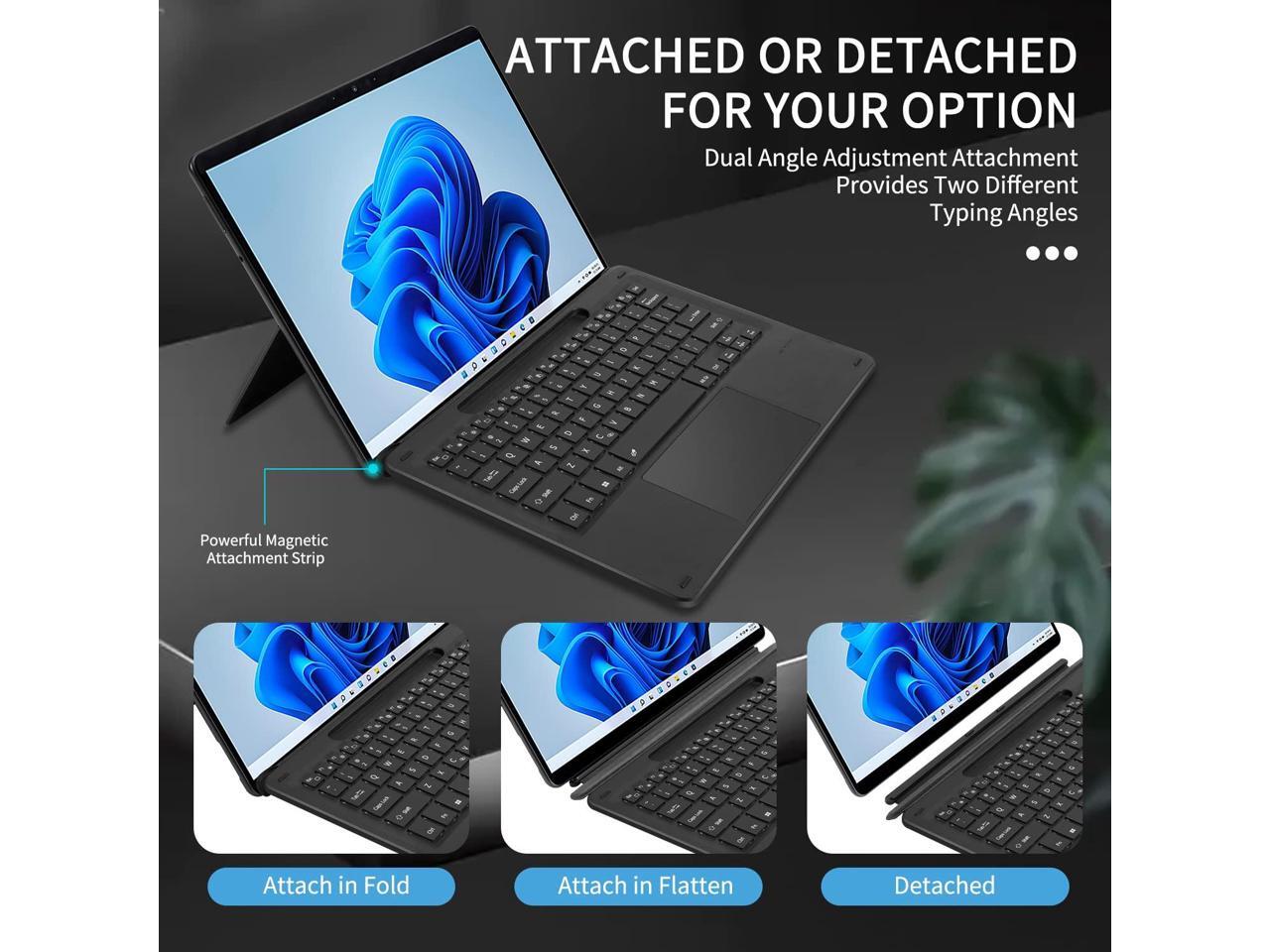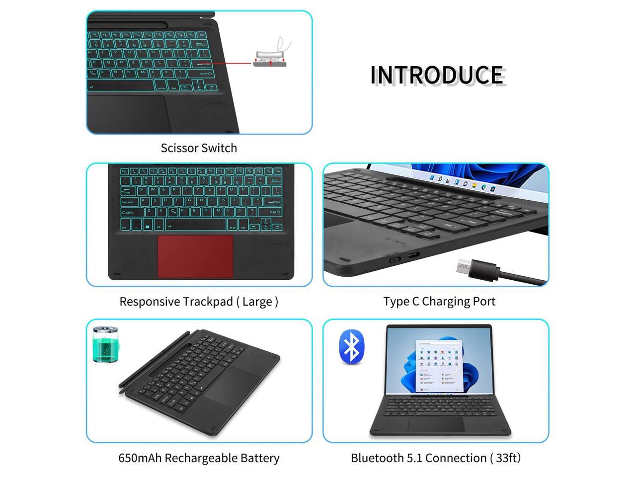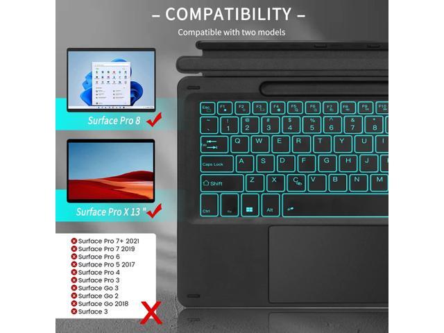 - Perfect Replacement for Original Keyboard: This wireless keyboard is physically attached to your Surface Pro 11/Pro 10/Pro 9/Pro 8/Pro X via magnetic like a laptop and connect through bluetooth, suitable for Microsoft Surface Pro 11/Pro 10/Pro 9/Pro 8/Pro X 13 inch tablet. Enjoy the easy control with touchpad and the media hot keys on the Bluetooth keyboard. Functions full mechanical keyset, backlit keys, and large touchpad for precise navigation and operate. Close or fold back to protect the tablet screen.