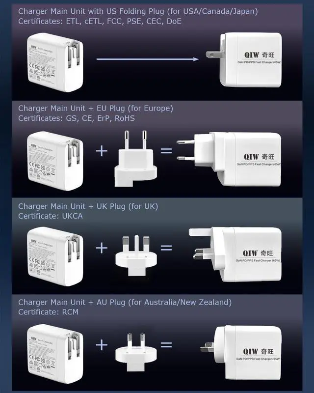 Compact & Travel-Ready: QIW 65W GaN USB C charger comes with 1 foldable US plug, 3 Interchangeable/Replaceable plugs (EU/UK/AU), and a 1.2m (3.9ft) USB-C to USB-C cable with E-marker Chip, making it compatible with outlets in the USA, Canada, Japan, Europe, the UK, Australia, and New Zealand. One set works across multiple countries, and with support for global voltage (100-240V), its ideal for home, office, or travel use.