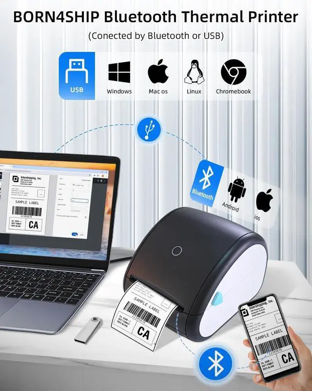 BORN4SHIP Thermal Label Printer 4x6, Bluetooth Shipping Label Printer for Small Businesses, with Built-in Paper Holder, Compatible with Amazon Shopify USPS