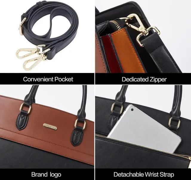 Telena Briefcase for Women Leather Computer Bag Vintage Fashion Laptop Work Business Black with Brown