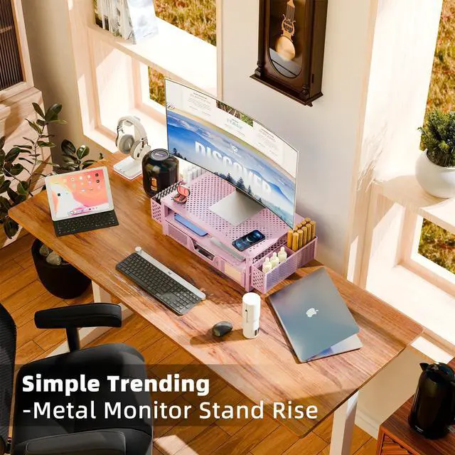 Simple Trending 2 Tier Metal Monitor Stand Monitor riser and Computer Desk Organizer with Drawer and Pen Holder for Laptop, Computer, iMac, Pink