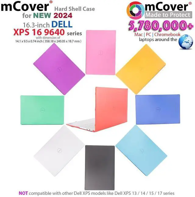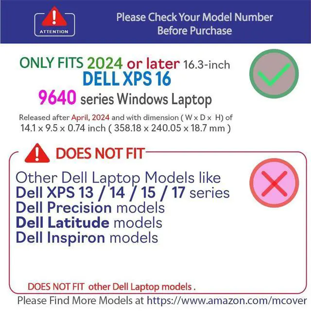 Designed to perfectly fit the 2024 or later 16.3" Dell XPS 16 9640 series Windows Notebook Computers with dimension of 14.1 x 9.5 x 0.74 inch ( 358.18 x 240.05 x 18.7 mm )