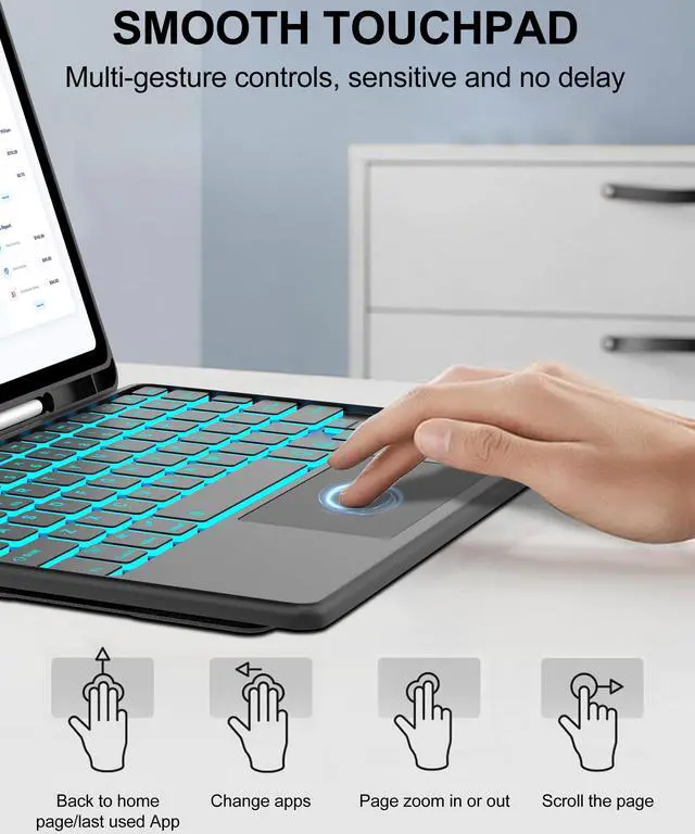 Bluetooth wireless backlit keyboard: contains 7 color backlights and 3 brightness levels. The edge-to-edge layout of well-spaced keys helps ensure familiar laptop-like typing. Comfortable and Responsive.
