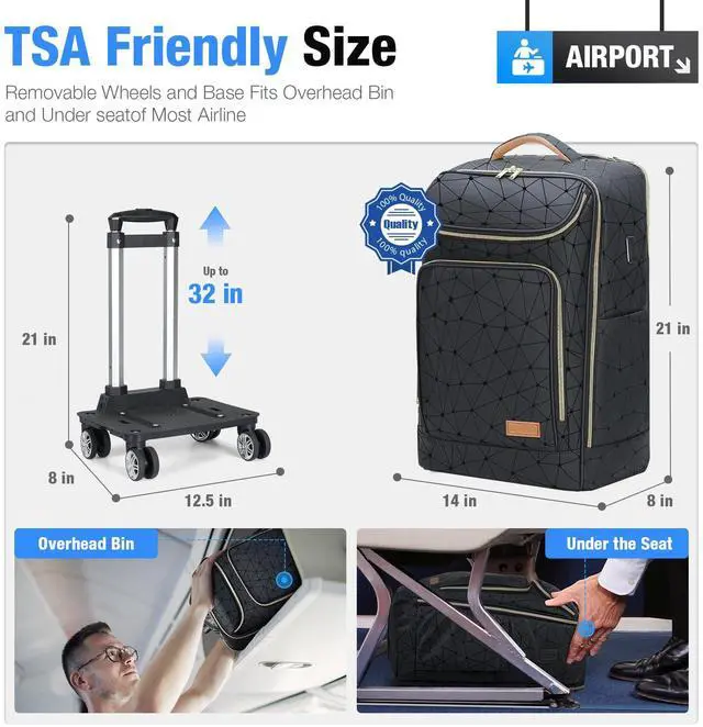 [Easy Conversion to Wheeled Trolley Bag]-Quickly transform this backpack into a convenient trolley bag, installing four rollers, pulling out the base clips fully, securely inserting the backpack into the base(Make sure the clip is firmly stuck in the base), and secure it in place with Velcro straps for stable, hands-free mobility.