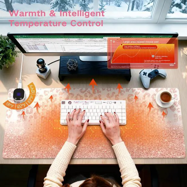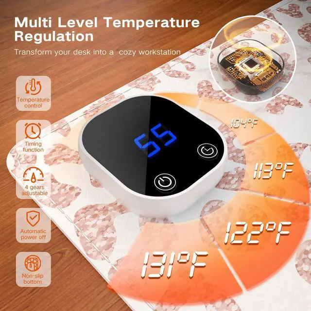 Customize your comfort with four adjustable temperature settings. For added safety and energy conservation, an intelligent 4-hour auto-shutoff function prevents overheatingsimply restart to continue use. This laptop desk mat functions as a smooth, responsive mouse surface all year and becomes a warming station when needed. It works perfectly as a heated mousepad or a full desk warmer for hands, wrists, or personal items, adapting seamlessly to seasonal needs. Crafted for durability, it includes waterproof materials and reinforced stitching to resist fraying, ensuring long-term reliability. Meeting certified safety standards, it offers worry-free daily operation.