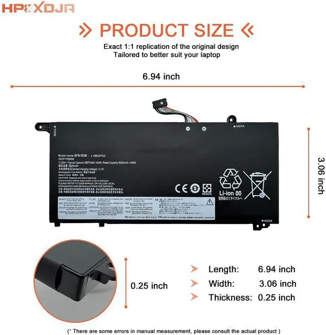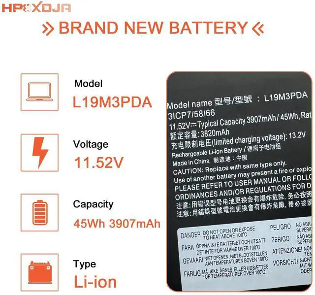 Battery Specifications L19M3PDA battery for Lenovo. Battery Type: Li-ion. Capacity: 45Wh 3907mAh. Voltage: 11.52V. WHAT YOU GET: 1 * L19M3PDA battery. 1 * User Manual. 4 * Screwdrivers.