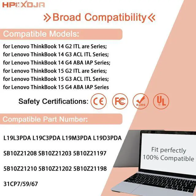 Compatible with L19M3PDA battery. Fit for Lenovo ThinkBook 14 G2 ITL are Series; Fit for Lenovo ThinkBook 14 G3 ACL ITL Series; Fit for Lenovo ThinkBook 14 G4 ABA IAP Series; Fit for Lenovo ThinkBook 15 G2 ITL are Series; Fit for Lenovo ThinkBook 15 G3 ACL ITL Series; Fit for Lenovo ThinkBook 15 G4 ABA IAP Series