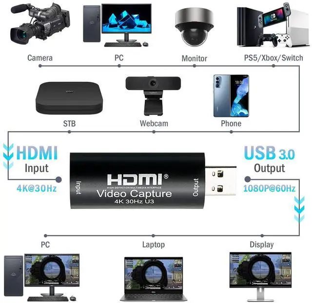 Max 4K@30fps Input & 1080P@60fps Full HD Output HDMI Video Capture Card input supports max resolution 4K@30fps. And output supports up to 1080P@60fps. USB video capture card support AWG26 HDMI standard cable input up to 15 meters. Audio Capture Card fits for devices with HDMI output port like PC, laptop, Switch, PS4/5, Xbox...etc. Also, you may output videos/contents from phone/tablets via cables with HDMI adpaters.