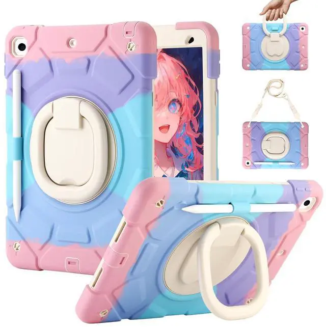 DUEEFA for iPad 9th/8th/7th Generation Case(2021/2020/2019), 360°Rotating Handle Stand with[ Pencil Holder&Shoulder Strap] Heavy Duty Shockproof Kids Cover for iPad 10.2 inch (Colorful Pink)