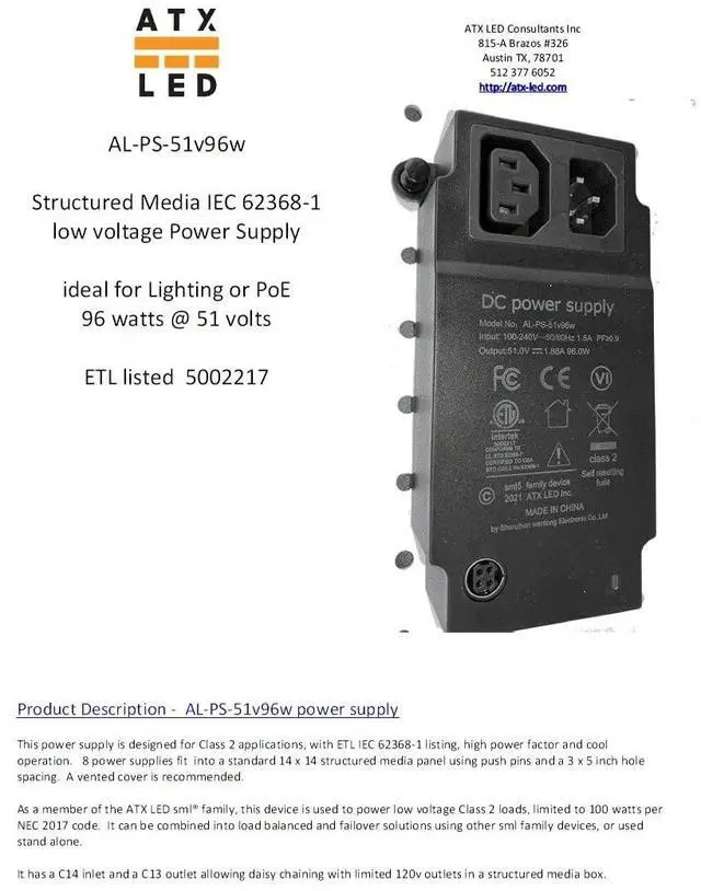 This DC power supply is designed for PoE switches and DC Lighting applications,. The output voltage is 51 Volts, 1.9 Amps - this is the specified voltage for 802.3 at and is allowed for 802.3 af. 96 Watts is under the limit for Class 2 wiring applications. This power supply fits perfectly into Leviton 47615 style structured media enclosures. It features high Power Factor, high efficiency and long life. It is certified according to ETL to UL62368-1 standards