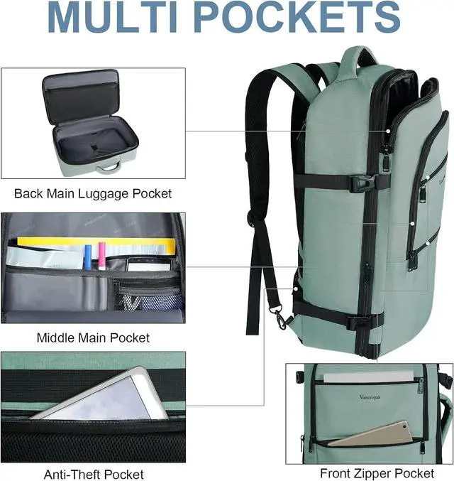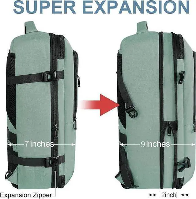 EXPANDABLE & LARGE CAPACITY: This large travel backpack with an expandable design gives you a greater capacity of up to 45 L. The main pocket can hold packing cubes, outfits, make-up bags, gear, etc. It also has built-in elastic bands to keep your clothes from falling out. The zip pocket in the back of the carry on backpack and front compartments can also hold phones, valuable objects, small items, etc ^^