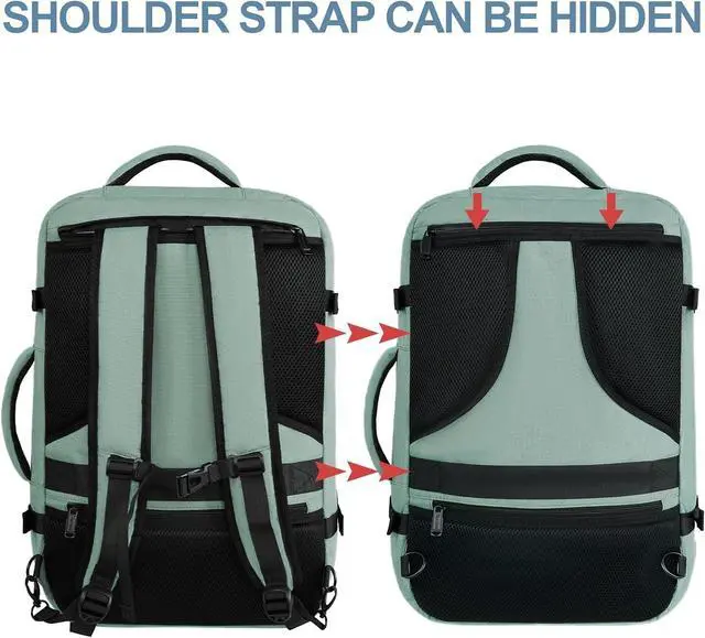 EASY TO CARRY: Designed with hide-away shoulder straps, adjustable chest straps, and 2 handle straps (on the topmost and the side of the backpack), the carry on travel backpack offers multiple carrying options as a backpack, suitcase. This luggage backpack meets the allowed maximum size of most IATA flights that fit in the overhead bin ^^