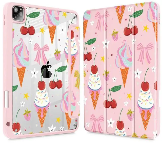 Lepeoac Case for iPad 12.9 Inch (6th/5th/4th/3rd Generation, 2022/2021/2020/2018), Pencel Holder + Trifold Support Auto Sleep/Wake, Transparent Shockproof Back Cover, Ice Cream-Bows-Pink