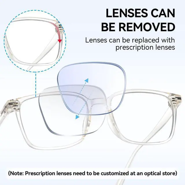 Anti-Glare Blue Light Glasses--Blue Light Blocking Glasses for woman men can effectively block harmful blue light from computer/phone/TV screen for users like computer glasses users and pilots. Non-prescription blue light glasses filter harmful light waves and UV 400 and reduce glare, protecting your eyes from the harmful effects of blue light. ^^ Good eye protection effect--These blue light glasses men reduce eye strain, headache, and blurred vision from prolonged exposure to blue light. Whether you are using a computer or any digital device, they help. ^^ RX-ABLE LENSES -- The DOLLGER transparent square blue light blocking glasses are non-prescription (Rx-able) and can be replaced with a prescription lens.