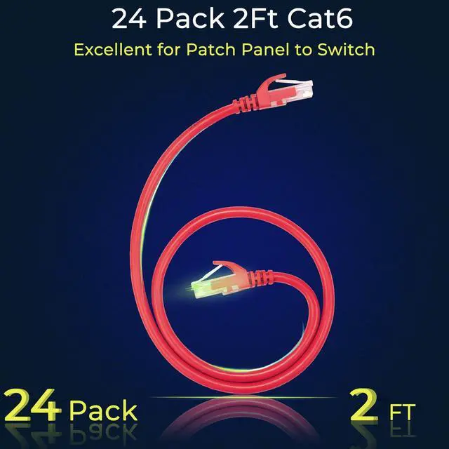24 Pack24-pack of CAT6 patch cables with short length is excellent solution for connecting patch panel to switch and other various devices in high performance. Available in various colors and length of cable patch cords. ^^ Save TimeThis premium ethernet cable save hours of time and hassle of cutting and crimping custom length cables for patch panels. Don't waste time on hand-making rj45 Internet cable. ^^ 10G speed via Gold plated pins All 8P8C of cat 6 patch cable are golden plated to support better network connection up to 10G speed 550MHZ ethernet network. This is a well pre-made 2ft cat6 patch cable with 26AWG stranded pure copper and can be used as cat6a patch cable to upgrade cat6a network.