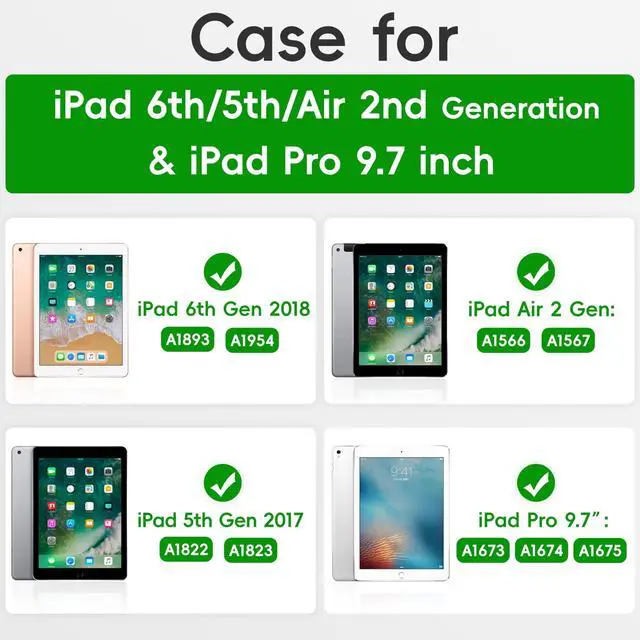 Compatibility: Case only for iPad 6th/5th Generation 9.7 inch (A1893/ A1954/ A1822/ A1823) 2018/2017 Release, iPad Air 2 (A1566/ A1567) and iPad Pro 9.7 (A1673 / A1674 / A1675). Please Check the bottom of your iPad to find the model number. Or visit ANDNARY to choose the right case for your iPad. ^^ 360