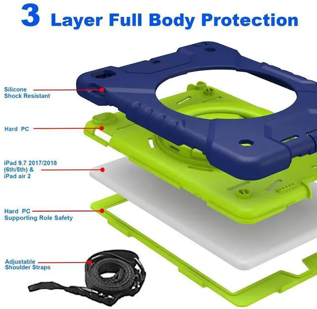 Precise Cutouts: The new iPad 9.7 case is made of high quality TPU and non-slip silicone, which is not only shock/shock/durable to provide full body protection for your 6th/5th/ generation iPad, but also keep your grip comfortable. All ports have precise cutouts for easy access to all buttons, speakers, cameras and sensors. ^^ 100% Satisfaction Customer ServiceWe provide this ipad case 9.7 inch Case with free adjustable shoulder straps to make it easy for you to use your iPad while traveling outdoors, working and playing with your kids. If you have any questions about our ipad case, please contact us immediately. We will definitely give you a satisfactory answer! The colorful colors are suitable for all ages. Ideal gift for birthdays, Valentine's Day, Christmas or other special occasions.