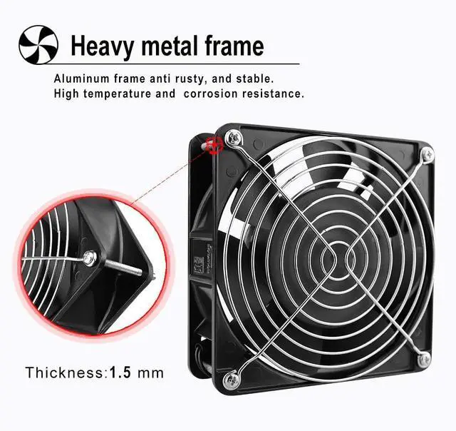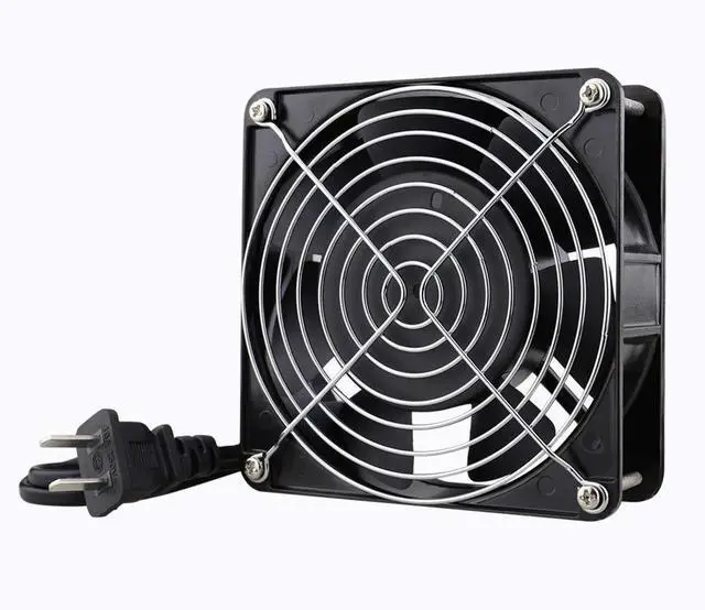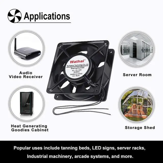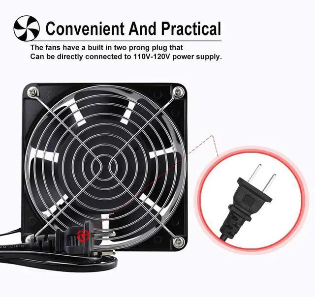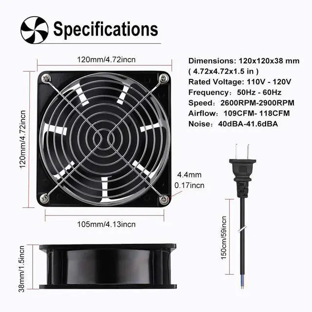 Dimensions: 120x120x38 mm ( 4.72 x 4.72 x 1.5 in ); 110 to 120V AC; Dual-ball bearings have a lifespan of 67, 000 hours and allows the fans to be laid flat or stand upright ^^ Muffin fan designed for projects that requires cooling or ventilation; or as a replacement fan for various products ^^ 1 Piece fan include fan grill and mounting screws & nuts; 1* Power Plug ( 59 inches) 1*Wiring head ^^ Under 50Hz; the Speed is 2600RPM; Airflow is 109CFM; Current is 0.35A; Power is 25W; Noise is 40dBA ^^ Under 60Hz; the Speed is 2900RPM; Airflow is 118CFM; Current is 0.26A; Power is 19W; Noise is 41.6 dBA