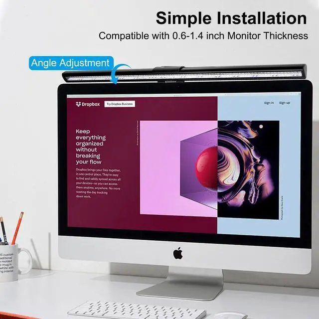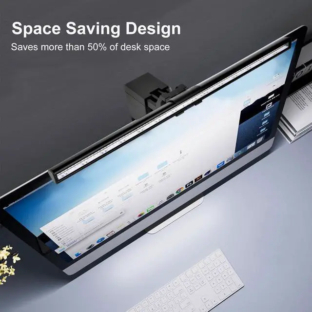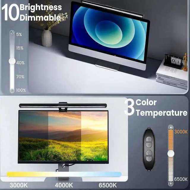 Protect your EyesNo screen glare, this monitor light bar adopts asymmetrical optical design only illuminates the keyboard and desk, eliminates reflective glare off the screen, no reflection and effectively protects your eyes, The 84 LED beads have a long lifespan which provide a soft and even lighting source and the lamp is designed to withstand daily wear and tear. ^^ Adjustable Brightness & 3 Color TemperatureOur screen moniter light bar offer 10 different brightness options (from 10% to 100%). 3 levels of color temperature: warm light (2800K), mix light (4000K), white light (6500K). The warm light lets you relax but the cool light allows you to concentrate and improve work efficiency. ^^ USB Powered & Easy to Install The computer usb light is powered by a 200cm USB cable, you can connect it to your computer, power bank, or any other USB-enabled device. Clip-on design, instant hassle-free setup, no damage your computer, fits any monitors with thickness from 0. 39" to 1.18" (1-3cm) ^^ Free up Desk Space Unique fixing structure design not only makes this computer monitor light sitting on top of the screen stably, but also won't block the camera, enjoy the vedio communication with your friends with ease. Frees up a lot of desk space, it is perfect choice for children, students, and office staff, ideal gift. ^^ Portable&StylishSleek matte black frame design makes it very stylish and elegant, perfect matching your PC/Desktop. The slim and lightweight design makes it easy to carry and use in different places, such as your home office, bedroom, or study room.